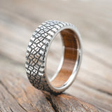 "PARCEL" - CUSTOM EMBOSSED TIRE TREAD WEDDING RING WITH A WHISKEY BARREL LINING