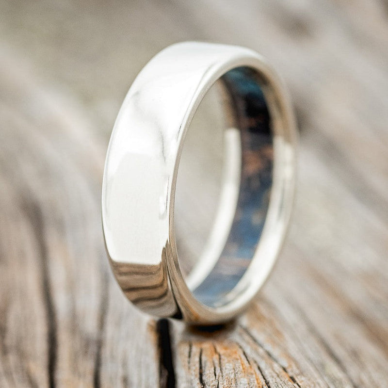 • Ring Style: A handcrafted men's wedding ring featuring a patina copper-lined band