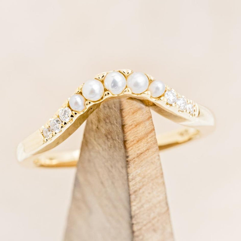• Ring Style: A custom, handcrafted women's stacking band featuring diamond and seed pearls