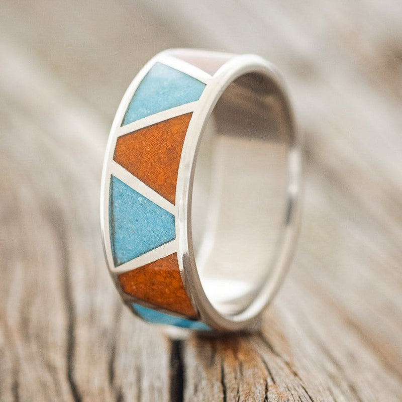 • Ring Style: "Powell" is a custom, handcrafted men's wedding ring featuring a terracotta & turquoise inlay