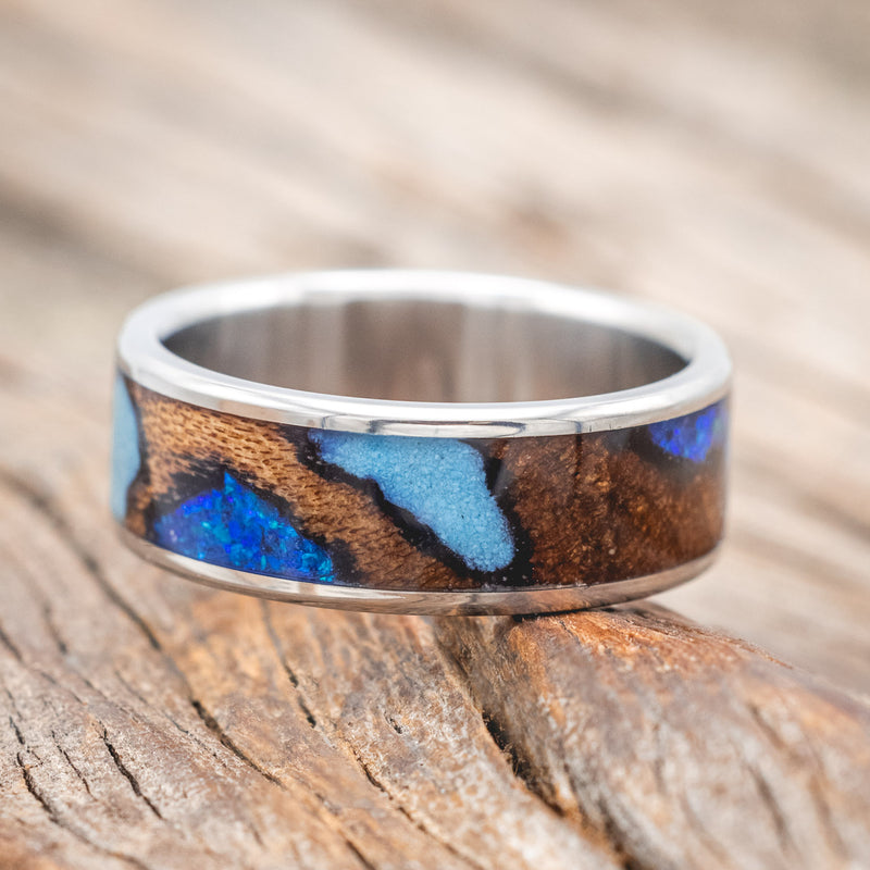 "RAINIER" - ELM BURL WOOD, BLUE OPAL & TURQUOISE WEDDING RING