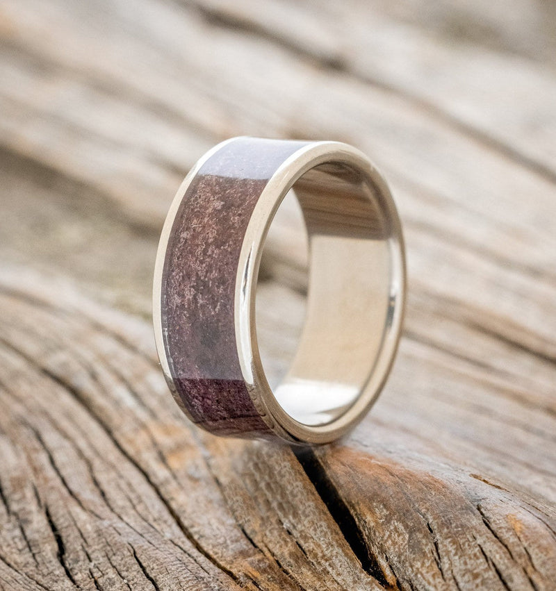 • Ring Style: The "Rainier" is a custom, handcrafted men's wedding ring featuring purpurite inlay. Additional inlay options are available upon request.