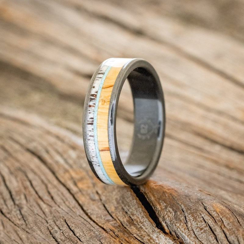 "RAINIER" - SPALTED MAPLE, ANTLER & TURQUOISE WEDDING BAND