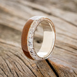 • Ring Style: "Remmy" is a custom, handcrafted men's wedding ring featuring ironwood and antler overlay with an offset fire & ice opal inlay