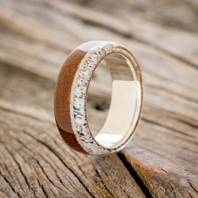 "REMMY" - IRONWOOD, ANTLER AND FIRE & ICE OPAL WEDDING RING