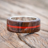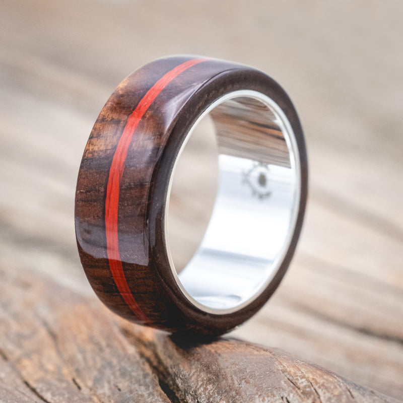 KOA WOOD WEDDING RING WITH A CENTERED RED FISHING LINE INLAY