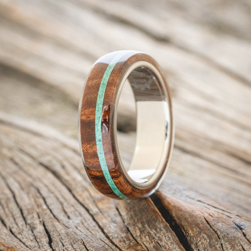 • Ring Style: "Remmy" is a custom, handcrafted men's wedding ring featuring a redwood overlay and an offset malachite inlay