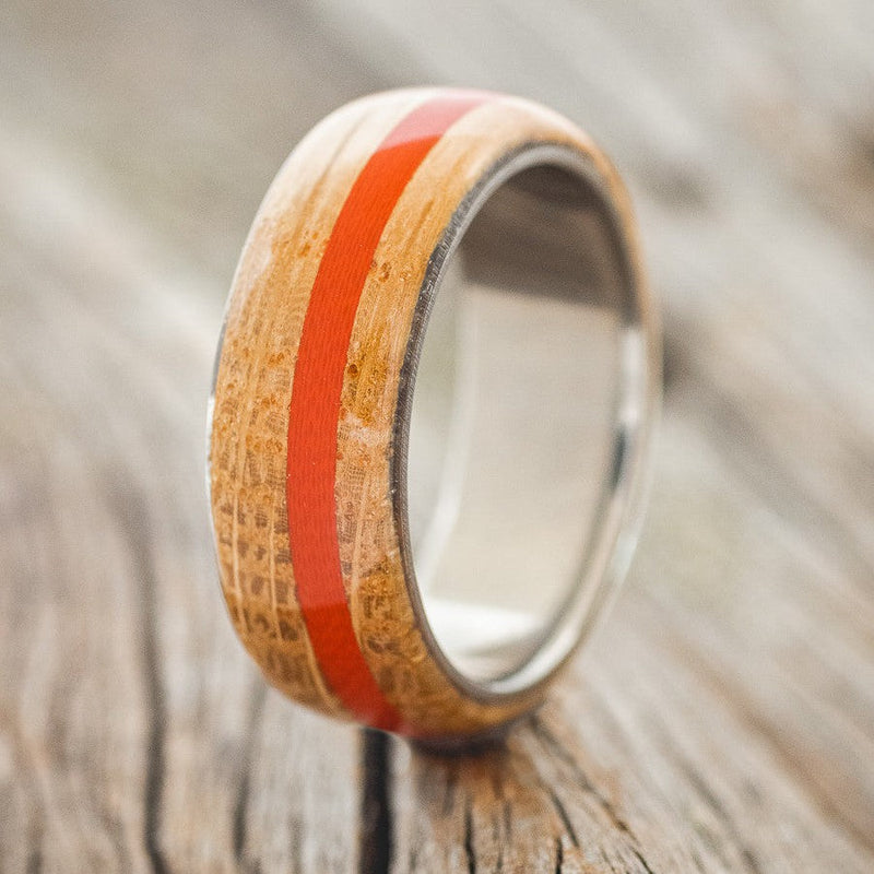• Ring Style: "Remmy" is a custom, handcrafted men's wedding ring featuring a whiskey barrel oak overlay and a red G10 inlay