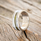 • Ring Style: "Rio" is a custom, handcrafted men's wedding ring featuring 3 channels with mossy patina copper and elk antler inlays. Additional inlay options are available upon request.