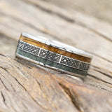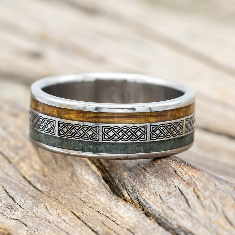• Ring Style: "Ryder" is a custom engraved Celtic sailor's knot-patterned men's wedding ring featuring a whiskey barrel oak & crushed moss agate inlays