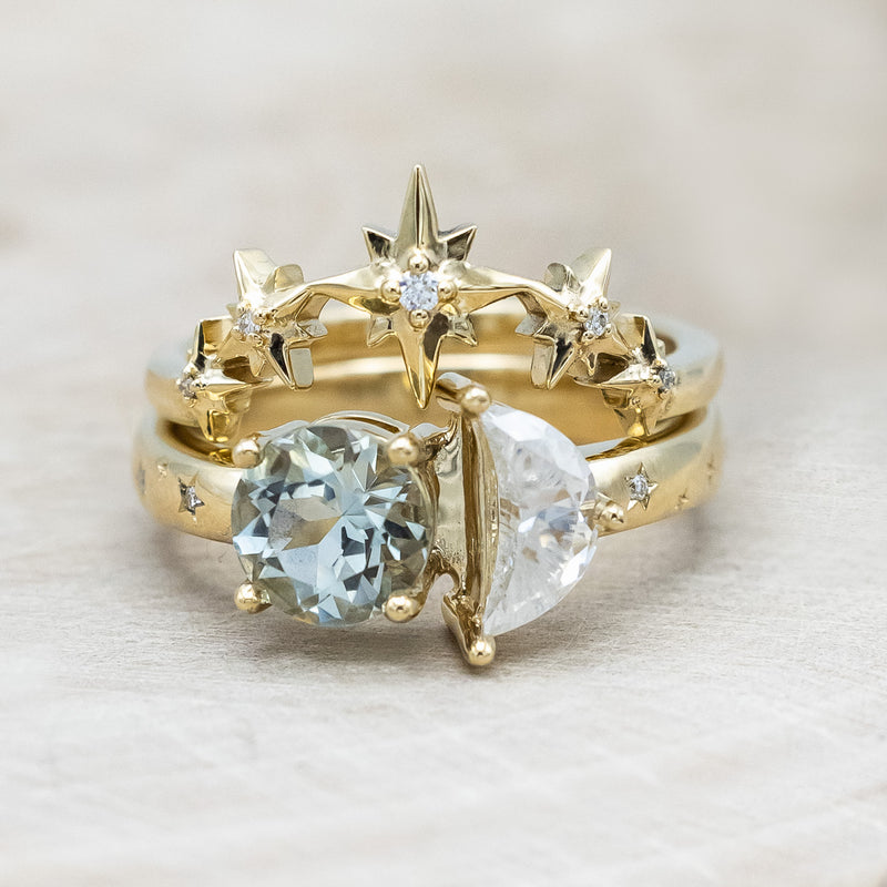 • Ring Style: The "Sidra" is a unique toi et moi round cut green prasiolite women's engagement ring with a crescent moon moissanite accent, and is shown with a celestial style diamond tracer