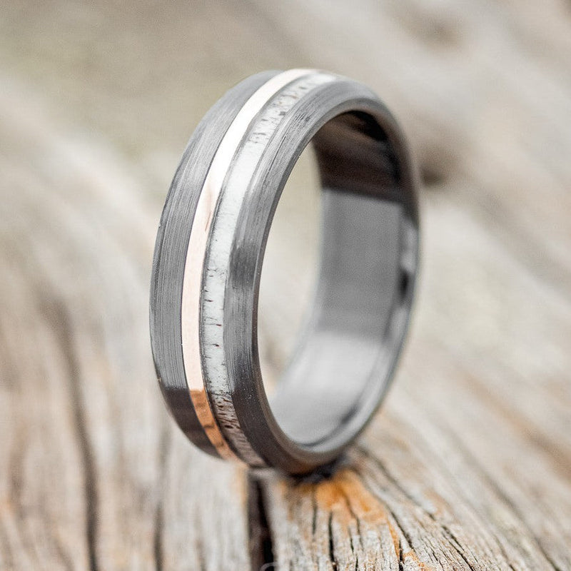 • Ring Style: "Tanner" is a custom, handcrafted men's brushed wedding ring featuring a naturally shed elk antler and a 14K rose gold inlay on a fire-treated black zirconium band. Additional inlay options are available upon request.