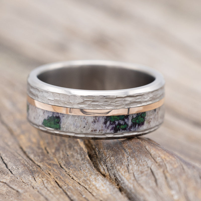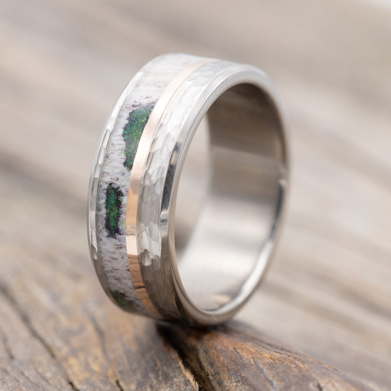 • Ring Style: "Tanner" is a custom, handcrafted hammered men's wedding ring featuring antler, moss and 14K rose gold inlay