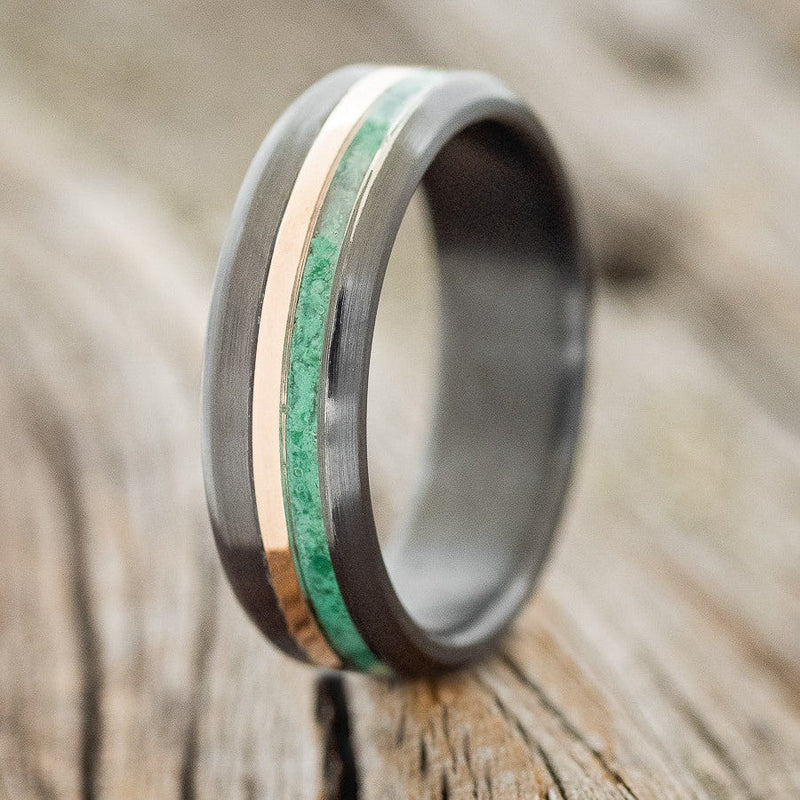 • Ring Style: "Tanner" is a custom, handcrafted men's wedding ring featuring a malachite and a 14K rose gold inlay on a brushed, fire-treated black zirconium band. Additional inlay options are available upon request.