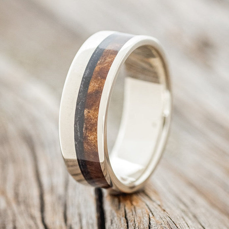 • Ring Style: "Tanner" is a custom, handcrafted men's wedding ring featuring redwood and jet stone inlays, shown here on a 14K white gold band. Additional inlay options are available upon request.
