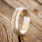 • Ring Style: "Tanner" is a custom, handcrafted men's wedding ring featuring whiskey barrel oak and antler inlay with a hammered finish