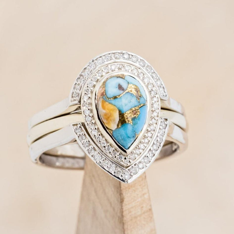 "TERRA" BRIDAL SUITE - PEAR CABOCHON CUT SPINY OYSTER TURQUOISE ENGAGEMENT RING WITH DIAMOND HALO & TRACERS
