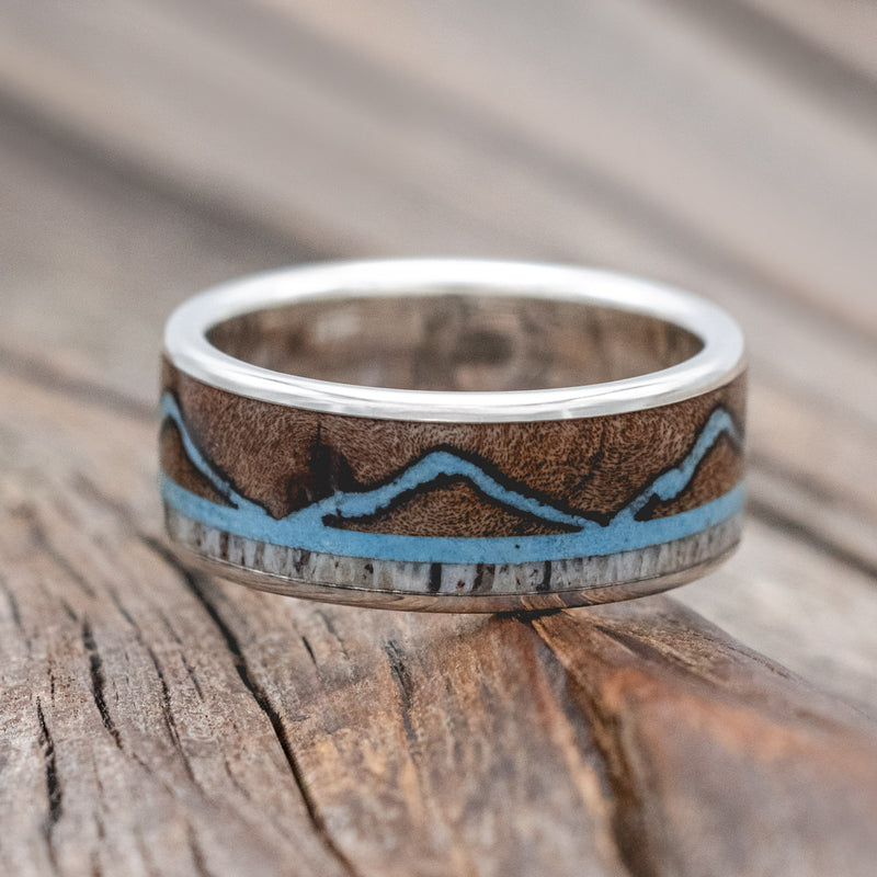 • Ring Style: "Expedition" is a custom, handcrafted men's wedding ring featuring a customizable mountain range and antler inlay