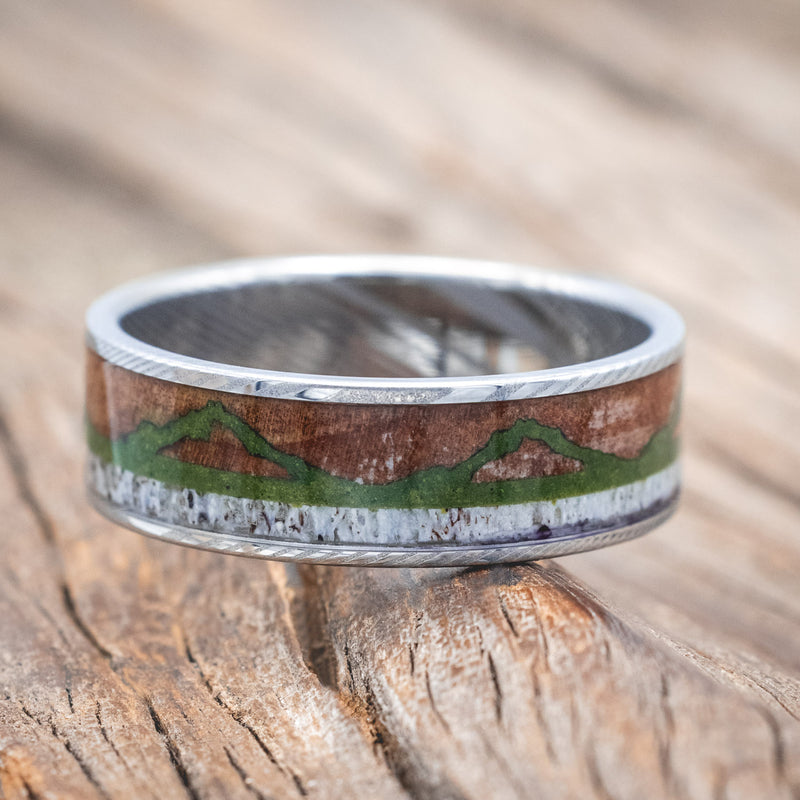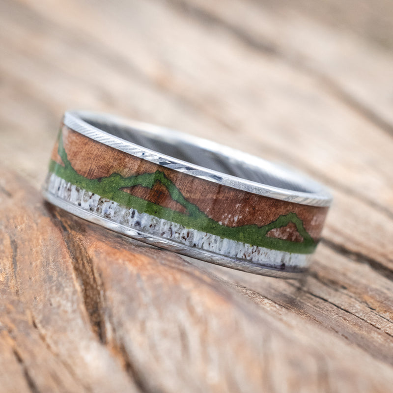 "THE EXPEDITION" - MOUNTAIN ENGRAVED WEDDING RING WITH REDWOOD, MOSS & ANTLER