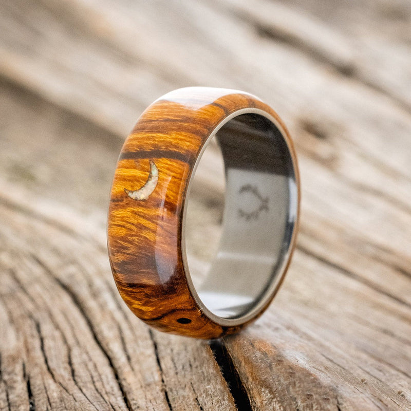 • Ring Style: The "Theron" is a custom, handcrafted men's wedding ring featuring an ironwood overlay that has a crescent moon engraved into it. The moon itself is filled with crushed fire and ice opal