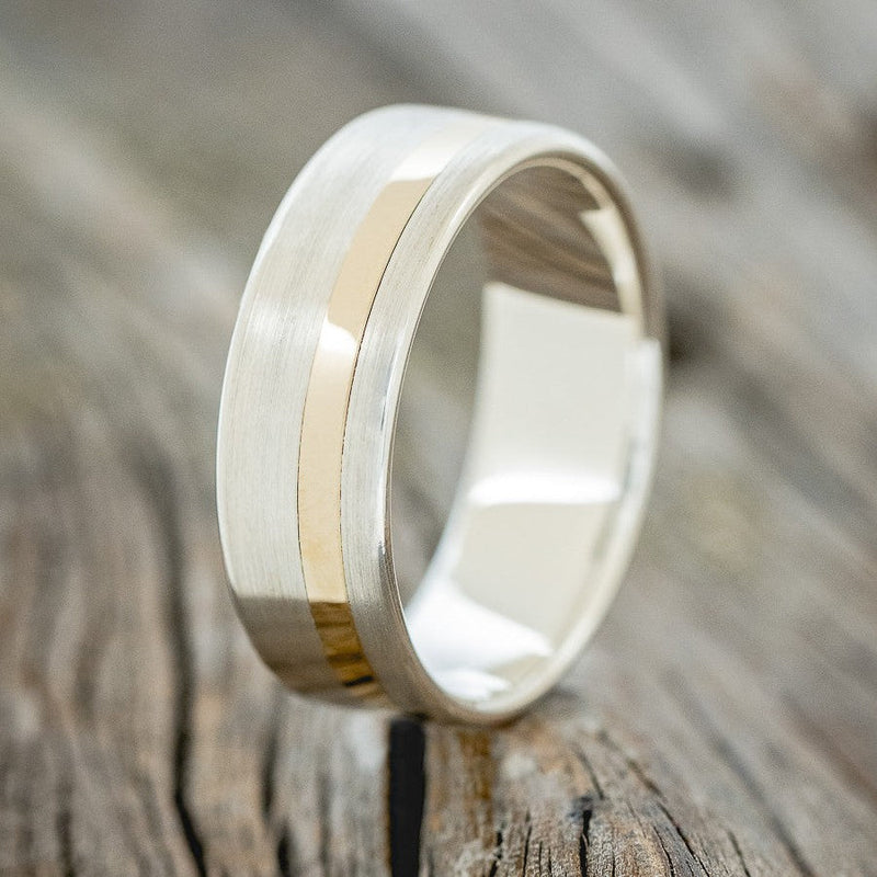 • Ring Style: "Vertigo" is a custom, handcrafted men's wedding ring featuring an offset 14K yellow gold inlay with a brushed band