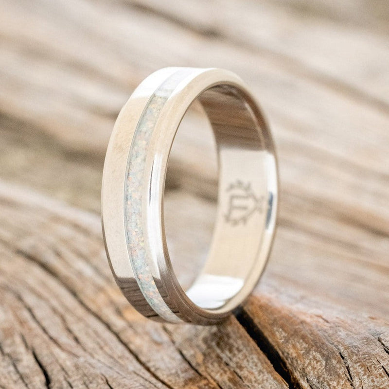 •   Ring Style: "Vertigo" is a custom, handcrafted men's wedding ring featuring a fire & ice opal inlay