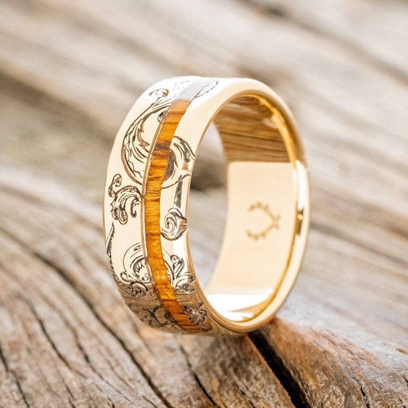 • Ring Style: "Vertigo" is a custom, handcrafted men's wedding ring featuring an offset ironwood inlay with a floral pattern engraving