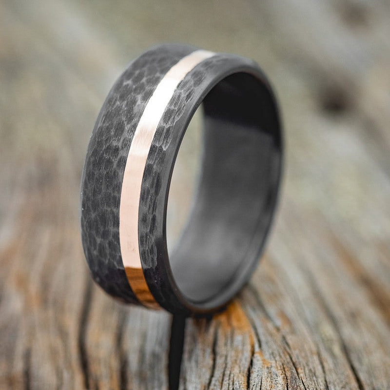 • Ring Style: "Vertigo" is a handcrafted men's wedding ring featuring an offset wide 14K rose gold inlay and a hammered finish. Shown here set on a fire-treated black zirconium wedding band. Additional inlay options are available upon request.