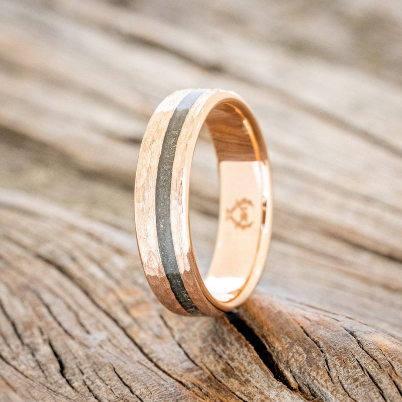 • Ring Style: "Vertigo" is a custom, handcrafted men's wedding ring featuring an offset pyrite inlay with a hammered finish. Additional inlay options are available upon request.