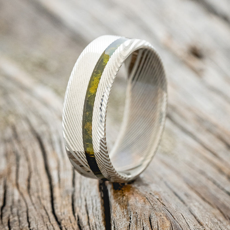 "VERTIGO" - MOSSY PATINA COPPER WEDDING BAND - DAMASCUS STEEL - SIZE 12 1/2