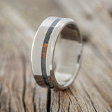 • Ring Style: "Vertigo" is a custom, handcrafted men's wedding ring featuring a patina copper inlay, shown here in a titanium band. Additional inlay options are available upon request.