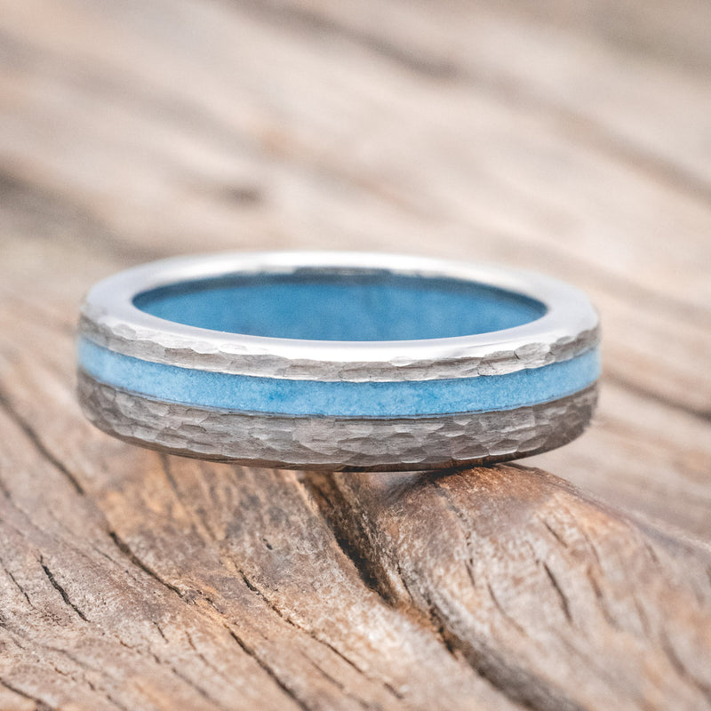 "VERTIGO" - TURQUOISE INLAY & LINED WEDDING RING WITH A HAMMERED FINISH