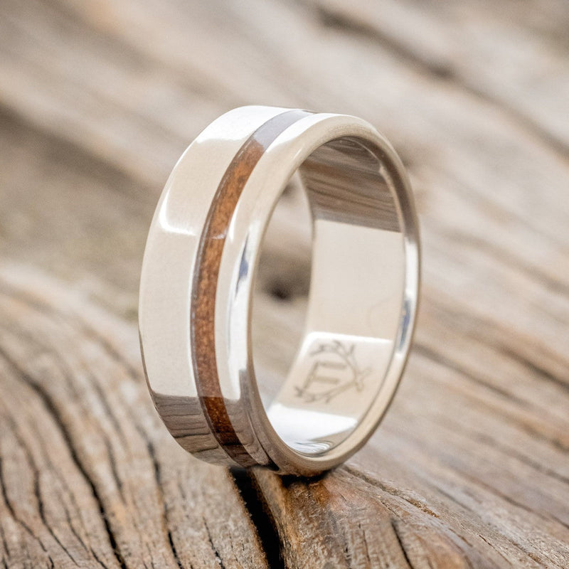 • Ring Style: The "Vertigo" is a handcrafted men's wedding ring featuring an offset walnut inlay. Additional inlay options are available upon request.