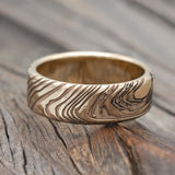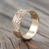 • Ring Style: A handcrafted men's wedding ring featuring a solid band with a woodgrain pattern